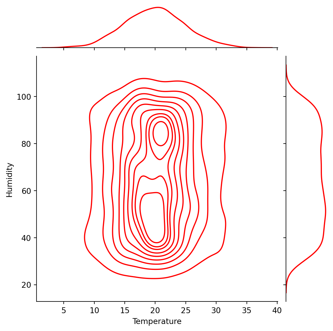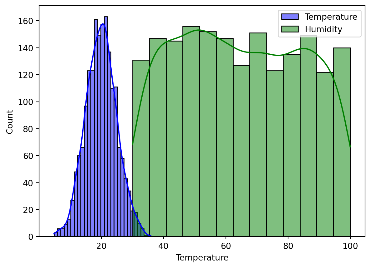 #Histograms and KDE (Kernel Density Estimation) plots for Temperature and Humidity.