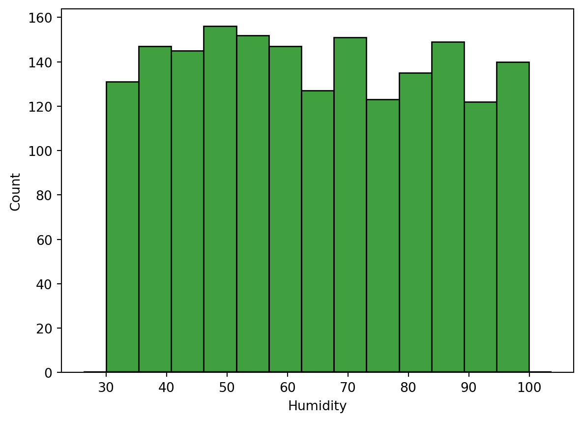 sns.histplot(weather_df['Humidity'], kde=False, color='green', label='Humidity')